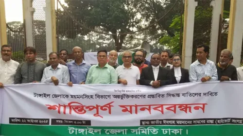 নিজস্ব প্রতিবেদক : ঢাকা বিভাগ থেকে টাঙ্গাইল জেলাকে ময়মনসিংহ বিভাগে অন্তর্ভুক্তির প্রস্তাবের প্রতিবাদে মঙ্গলবার (২২ অক্টোবর ) বিকেলে রাজধানী ঢাকায় জাতীয় ঈদগাহ ময়দানের সামনে টাঙ্গাইল জেলা সমিতির উদ্যোগে এক মানববন্ধন…